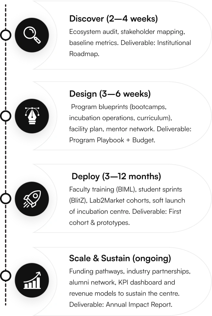 Faculty training (BIML), student sprints (BlitZ), Lab2Market cohorts, soft launch of incubation centre. Deliverable: First cohort & prototypes.